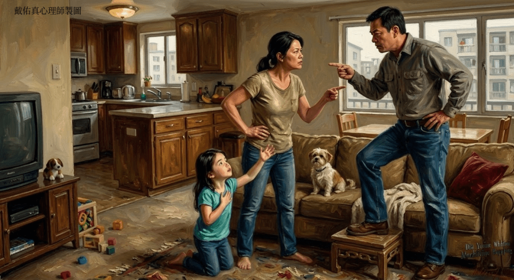 在父母衝突下成長的孩子,常常無法理解父母為何而吵,因為當時的大腦還沒能發展到理解事情全像的能力,但卻能深切感受到情緒的張力,害怕是最直接的情緒,強烈的害怕,包括了衝突的聲音、畫面、害怕被捲入衝突(被打、被罵、無法逃脫的碎唸…)、害怕父或母受傷、恐懼家庭關係破裂、害怕他們去死、害怕被遺棄…有太多的害怕,隱藏在小小的心靈裡,不能說也沒有機會說…